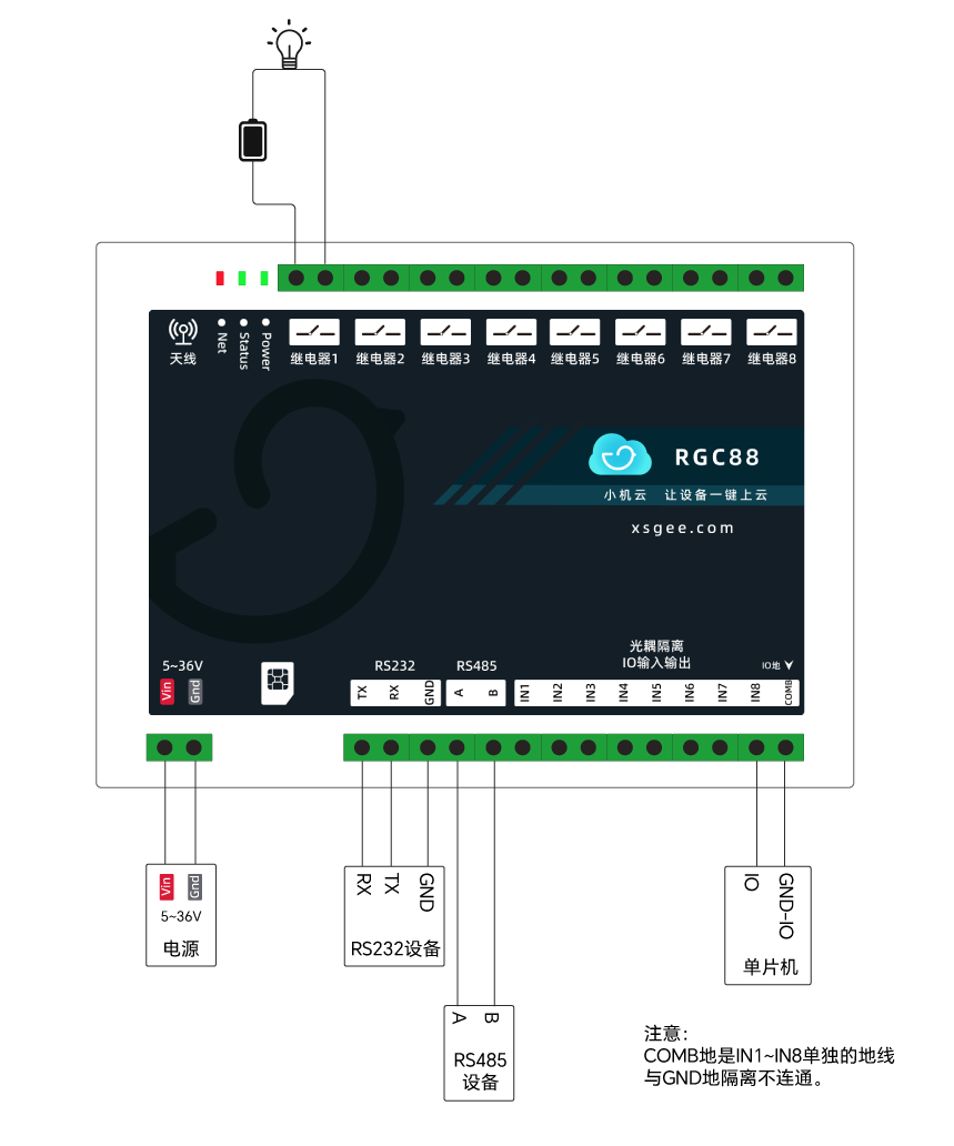 支持 8 路常开 2 脚继电器输出(交流 220V/5A ,直流 30V/5A 继电器) ;
